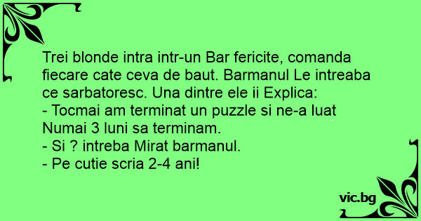 Trei blonde intra intr-un Bar fericite, comanda fiecare cate ceva de baut. Barmanul Le intreaba ce sarbatoresc. Una dintre ele ii Explica: