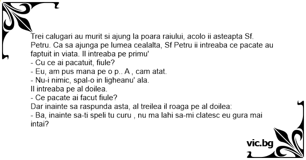 Trei calugari au murit si ajung la poara raiului, acolo ii asteapta Sf. Petru. Ca sa ajunga pe lumea cealalta, Sf Petru ii intreaba ce pacate au faptuit in viata. Il intreaba pe primu'