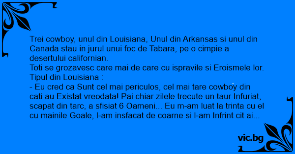- Eu cred ca Sunt cel mai periculos, cel mai tare cowboy din cati au Existat vreodata! Pai chiar zilele trecute un taur Infuriat, scapat din tarc, a sfisiat 6 Oameni... Eu m-am luat la trinta cu el cu mainile Goale, l-am insfacat de coarne si l-am Infrint cit ai zice peste!