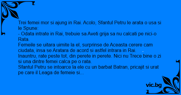Femeile se uitara uimite la el, surprinse de Aceasta cerere cam ciudata, insa se Aratara de acord si astfel intrara in Rai.