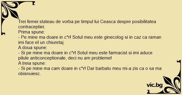 - Pe mine ma doare in c*r! Sotul meu este ginecolog si in caz ca raman imi face el un chiuretaj.