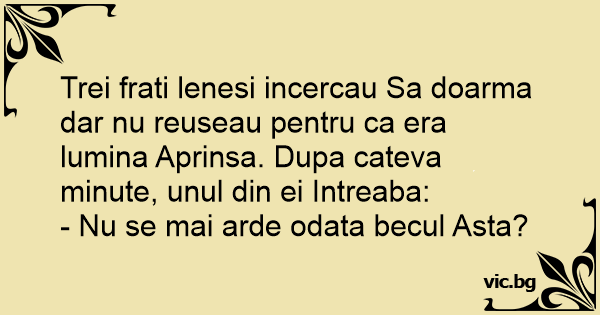 Trei frati lenesi incercau Sa doarma dar nu reuseau pentru ca era lumina Aprinsa. Dupa cateva minute, unul din ei Intreaba: