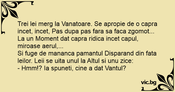 Trei lei merg la Vanatoare. Se apropie de o capra incet, incet, Pas dupa pas fara sa faca zgomot... La un Moment dat capra ridica incet capul, miroase aerul,...