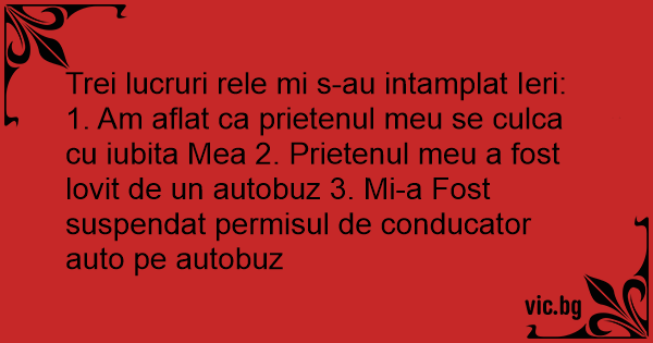 1. Am aflat ca prietenul meu se culca cu iubita Mea 2. Prietenul meu a fost lovit de un autobuz 3. Mi-a Fost suspendat permisul de conducator auto pe autobuz