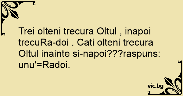 Trei olteni trecura Oltul , inapoi trecuRa-doi . Cati olteni trecura Oltul inainte si-napoi???raspuns: unu'=Radoi.