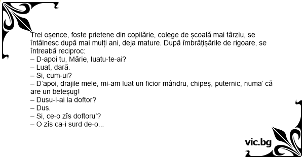 Trei oșence, foste prietene din copilărie, colege de școală mai târziu, se întâlnesc după mai mulți ani, deja mature. După îmbrățișările de rigoare, se întreabă reciproc: