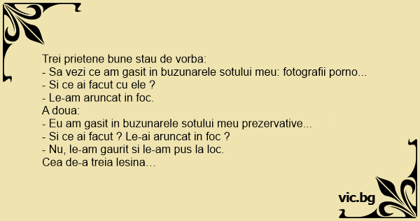 Trei prietene bune stau de vorba: - Sa vezi ce am gasit in buzunarele sotului meu: fotografii роrnо... - Si ce ai facut cu ele ? - Le-am aruncat in foc. A doua: - Eu am gasit in buzunarele sotului meu prezervative... - Si ce ai facut ? Le-ai aruncat in foc ? - Nu, le-am gaurit si le-am pus la loc. Cea de-a treia lesina…