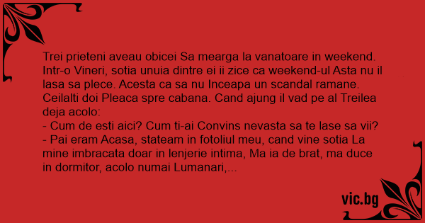 Trei prieteni aveau obicei Sa mearga la vanatoare in weekend. Intr-o Vineri, sotia unuia dintre ei ii zice ca weekend-ul Asta nu il lasa sa plece. Acesta ca sa nu Inceapa un scandal ramane. Ceilalti doi Pleaca spre cabana. Cand ajung il vad pe al Treilea deja acolo: