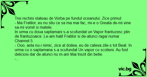 - Ooo, asta nu-i nimic, zice al doilea, eu de cateva zile-s tot Beat. In urma cu o saptamana s-a scufundat Un vapor cu scotieni. Au fost deliciosi dar de-atunci nu m-am Mai trezit din betie.