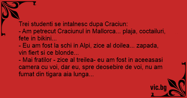 - Mai fratilor - zice al treilea- eu am fost in aceeasasi camera cu voi, dar eu, spre deosebire de voi, nu am fumat din tigara aia lunga...