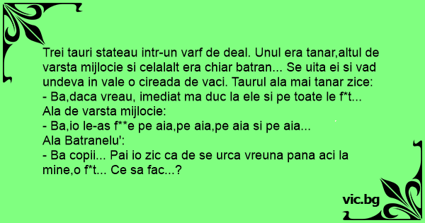 Trei tauri stateau intr-un varf de deal. Unul era tanar,altul de varsta mijlocie si celalalt era chiar batran... Se uita ei si vad undeva in vale o cireada de vaci. Taurul ala mai tanar zice: