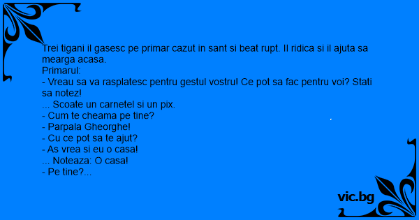 Trei tigani il gasesc pe primar cazut in sant si beat rupt. Il ridica si il ajuta sa mearga acasa.