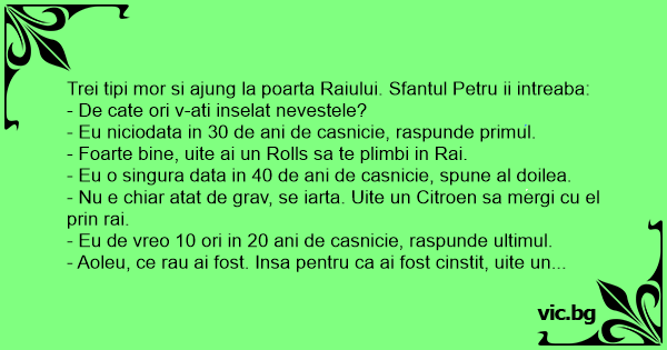 Trei tipi mor si ajung la poarta Raiului. Sfantul Petru ii intreaba: