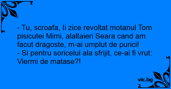 - Tu, scroafa, Ii zice revoltat motanul Tom pisicutei Mimi, alaltaieri Seara cand am facut dragoste, m-ai umplut de purici!