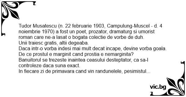 Tudor Musatescu (n. 22 februarie 1903, Campulung-Muscel - d. 4 noiembrie 1970) a fost un poet, prozator, dramaturg si umorist roman care ne-a lasat o bogata colectie de vorbe de duh.