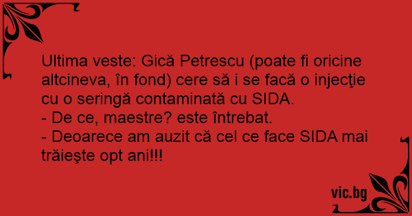 Ultima veste: Gică Petrescu (poate fi oricine altcineva, în fond) cere să i se facă o injecţie cu o seringă contaminată cu SIDA.
