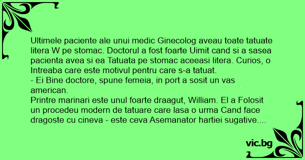 Ultimele paciente ale unui medic Ginecolog aveau toate tatuate litera W pe stomac. Doctorul a fost foarte Uimit cand si a sasea pacienta avea si ea Tatuata pe stomac aceeasi litera. Curios, o Intreaba care este motivul pentru care s-a tatuat.