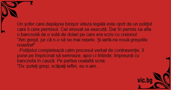 Un şofer care depăşise binişor viteza legală este oprit de un poliţist care îi cere permisul. Cel vinovat se execută. Dar în permis sa afla o bancnotă de o sută de dolari pe care era scris cu creionul: