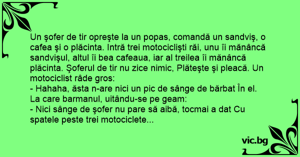 Un şofer de tir opreşte la un popas, comandă un sandviş, o cafea şi o plăcinta. Intră trei motociclişti răi, unu îi mănâncă sandvişul, altul îi bea cafeaua, iar al treilea îi mănâncă plăcinta. Şoferul de tir nu zice nimic, Plăteşte şi pleacă. Un motociclist râde gros: