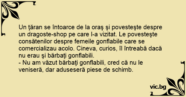 Un ţăran se întoarce de la oraş şi povesteşte despre un dragoste-shop pe care l-a vizitat. Le povesteşte consătenilor despre femeile gonflabile care se comercializau acolo. Cineva, curios, îl întreabă dacă nu erau şi bărbaţi gonflabili.