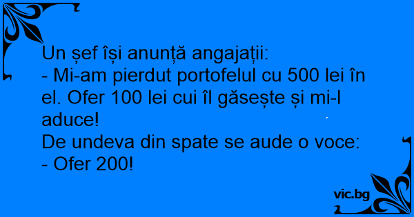 - Mi-am pierdut portofelul cu 500 lei în el. Ofer 100 lei cui îl găsește și mi-l aduce!
