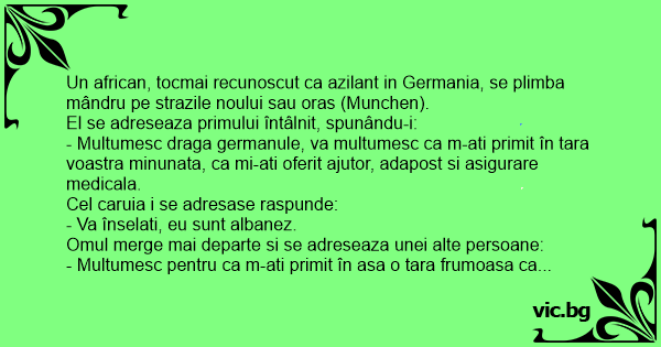 Un african, tocmai recunoscut ca azilant in Germania, se plimba mândru pe strazile noului sau oras (Munchen).