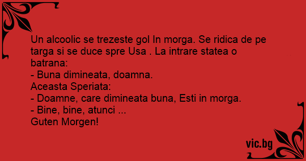 Un alcoolic se trezeste gol In morga. Se ridica de pe targa si se duce spre Usa . La intrare statea o batrana: