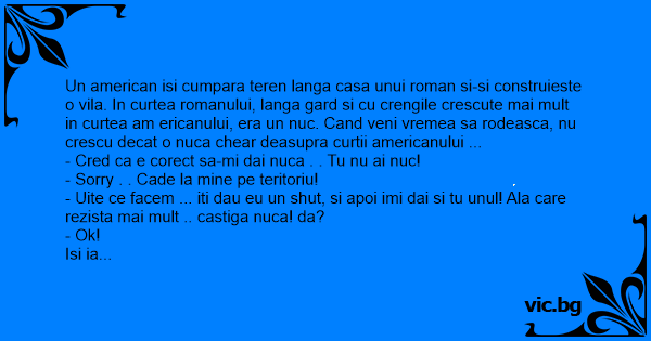 Un american isi cumpara teren langa casa unui roman si-si construieste o vila. In curtea romanului, langa gard si cu crengile crescute mai mult in curtea am ericanului, era un nuc. Cand veni vremea sa rodeasca, nu crescu decat o nuca chear deasupra curtii americanului ...