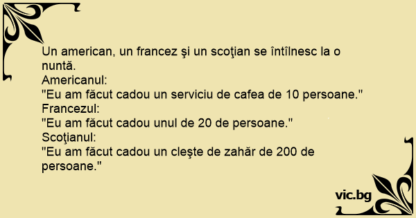 Un american, un francez şi un scoţian se întîlnesc la o nuntă.