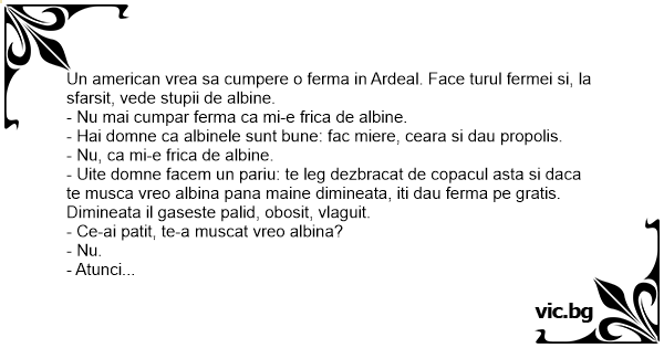 Un american vrea sa cumpere o ferma in Ardeal. Face turul fermei si, la sfarsit, vede stupii de albine. - Nu mai cumpar ferma ca mi-e frica de albine. - Hai domne ca albinele sunt bune: fac miere, ceara si dau propolis. - Nu, ca mi-e frica de albine. - Uite domne facem un pariu: te leg dezbracat de copacul asta si daca te musca vreo albina pana maine dimineata, iti dau ferma pe gratis. Dimineata il gaseste palid, obosit, vlaguit. - Ce-ai patit, te-a muscat vreo albina? - Nu. - Atunci ce? - Nene, vitelul de acolo n-are mama?
