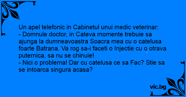 - Domnule doctor, in Cateva momente trebuie sa ajunga la dumneavoastra Soacra mea cu o catelusa foarte Batrana. Va rog sa-i faceti o Injectie cu o otrava puternica, sa nu se chinuie!