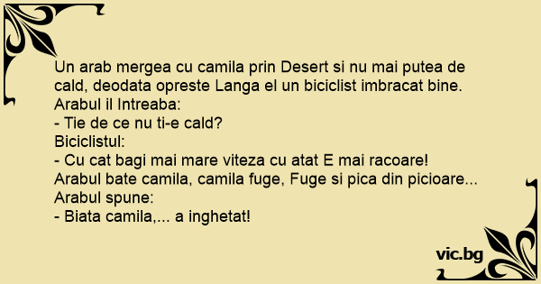 Un arab mergea cu camila prin Desert si nu mai putea de cald, deodata opreste Langa el un biciclist imbracat bine. Arabul il Intreaba: