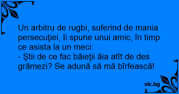 - Ştii de ce fac băieţii ăia atît de des grămezi? Se adună să mă bîrfească!