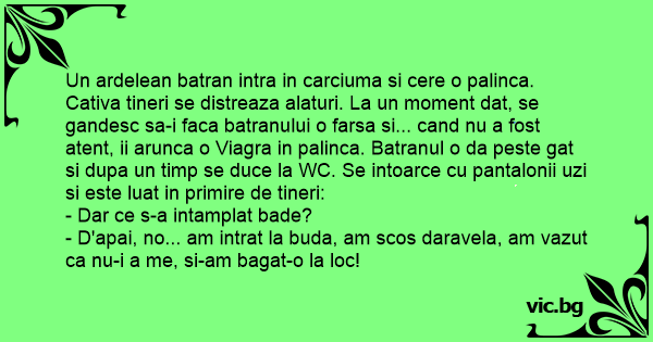 Un ardelean batran intra in carciuma si cere o palinca. Cativa tineri se distreaza alaturi. La un moment dat, se gandesc sa-i faca batranului o farsa si... cand nu a fost atent, ii arunca o Viаgrа in palinca. Batranul o da peste gat si dupa un timp se duce la WC. Se intoarce cu pantalonii uzi si este luat in primire de tineri:
