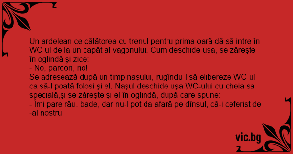 Un ardelean ce călătorea cu trenul pentru prima oară dă să intre în WC-ul de la un capăt al vagonului. Сuм deschide uşa, se zăreşte în oglindă şi zice: