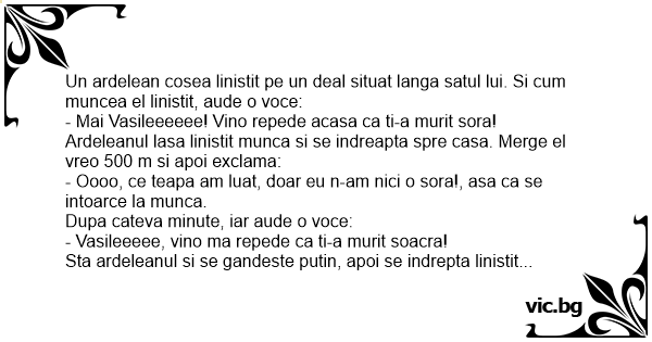Sta ardeleanul si se gandeste putin, apoi se indrepta linistit catre casa. Dupa 10 minute isi da seama ca el nu are nici soacra, asa ca se intoarce linistit la munca. Dupa alte 10 minute, aude iar o voce dinspre sat: