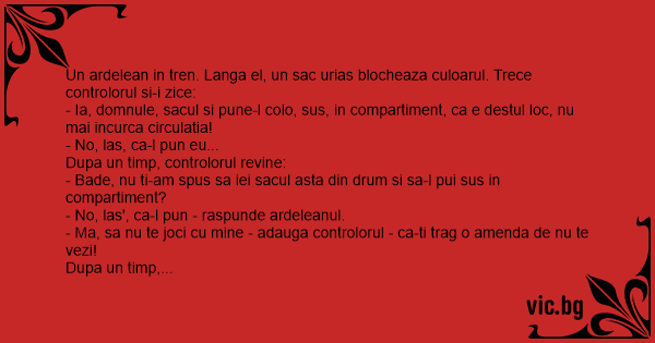 Si, nici una, nici doua, ii arde o amenda usturatoare. Ardeleanul plateste, iar controlorul pleaca. Dar un alt calator, care vazuse totul, nu se abtine si-l intreaba pe ardelean: