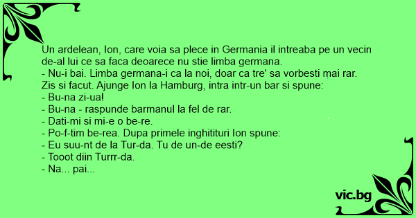 Un ardelean, Ion, care voia sa plece in Germania il intreaba pe un vecin de-al lui ce sa faca deoarece nu stie limba germana.