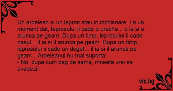 Un ardelean si un lepros stau in inchisoare. La un moment dat, leprosului ii cade o ureche... o ia si o arunca pe geam. Dupa un timp, leprosului ii cade nasul... il ia si il arunca pe geam. Dupa un timp, leprosului ii cade un deget... il ia si il arunca pe geam... Ardeleanul nu mai suporta: