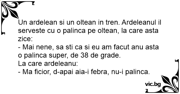 Un ardelean si un oltean in tren. Ardeleanul il serveste cu o palinca pe oltean, la care asta zice: