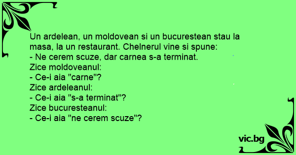 Un ardelean, un moldovean si un bucurestean stau la masa, la un restaurant. Chelnerul vine si spune: