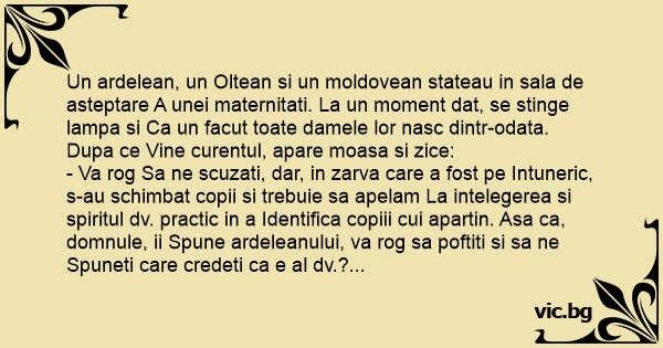 Un ardelean, un Oltean si un moldovean stateau in sala de asteptare A unei maternitati. La un moment dat, se stinge lampa si Ca un facut toate damele lor nasc dintr-odata. Dupa ce Vine curentul, apare moasa si zice: