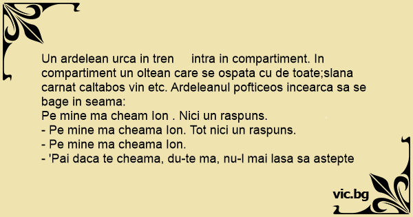 Un ardelean urca in tren intra in compartiment. In compartiment un oltean care se ospata cu de toate;slana carnat caltabos vin etc. Ardeleanul pofticeos incearca sa se bage in seama: