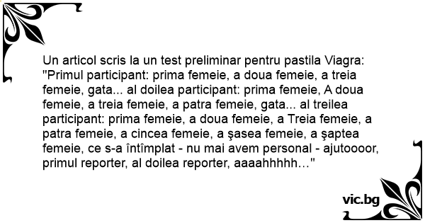 Un articol scris la un test preliminar pentru pastila Viаgrа: "Primul participant: prima femeie, a doua femeie, a treia femeie, gata... al doilea participant: prima femeie, A doua femeie, a treia femeie, a patra femeie, gata... al treilea participant: prima femeie, a doua femeie, a Treia femeie, a patra femeie, a cincea femeie, a şasea femeie, a şaptea femeie, ce s-a întîmplat - nu mai avem personal - ajutoooor, primul reporter, al doilea reporter, aaaahhhhh…"