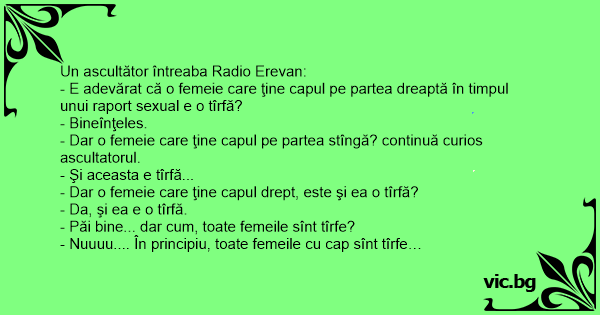 - E adevărat că o femeie care ţine capul pe partea dreaptă în timpul unui raport sеxuаl e o tîrfă?