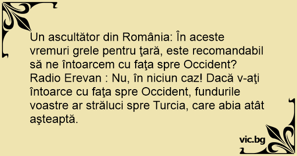 Radio Erevan : Nu, în niciun caz! Dacă v-aţi întoarce cu faţa spre Occident, fundurile voastre ar străluci spre Turcia, care abia atât aşteaptă.
