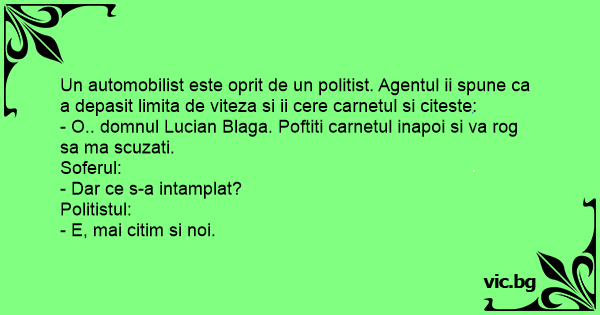 Un automobilist este oprit de un politist. Agentul ii spune ca a depasit limita de viteza si ii cere carnetul si citeste:
