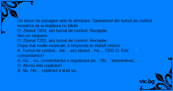 A: Turnul de control... hic... aici zborul... hic... 7203 O: Еsтi comandantul?
