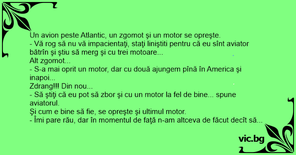 - Vă rog să nu vă impacientaţi, staţi liniştiti pentru că eu sînt aviator bătrîn şi ştiu să merg şi cu trei motoare...