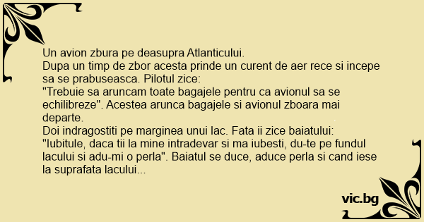 "Iubitule, daca tii la mine intradevar si ma iubesti, du-te pe fundul lacului si adu-mi o perla". Baiatul se duce, aduce perla si cand iese la suprafata lacului ii саd in cap bagajele din bancul trecut.